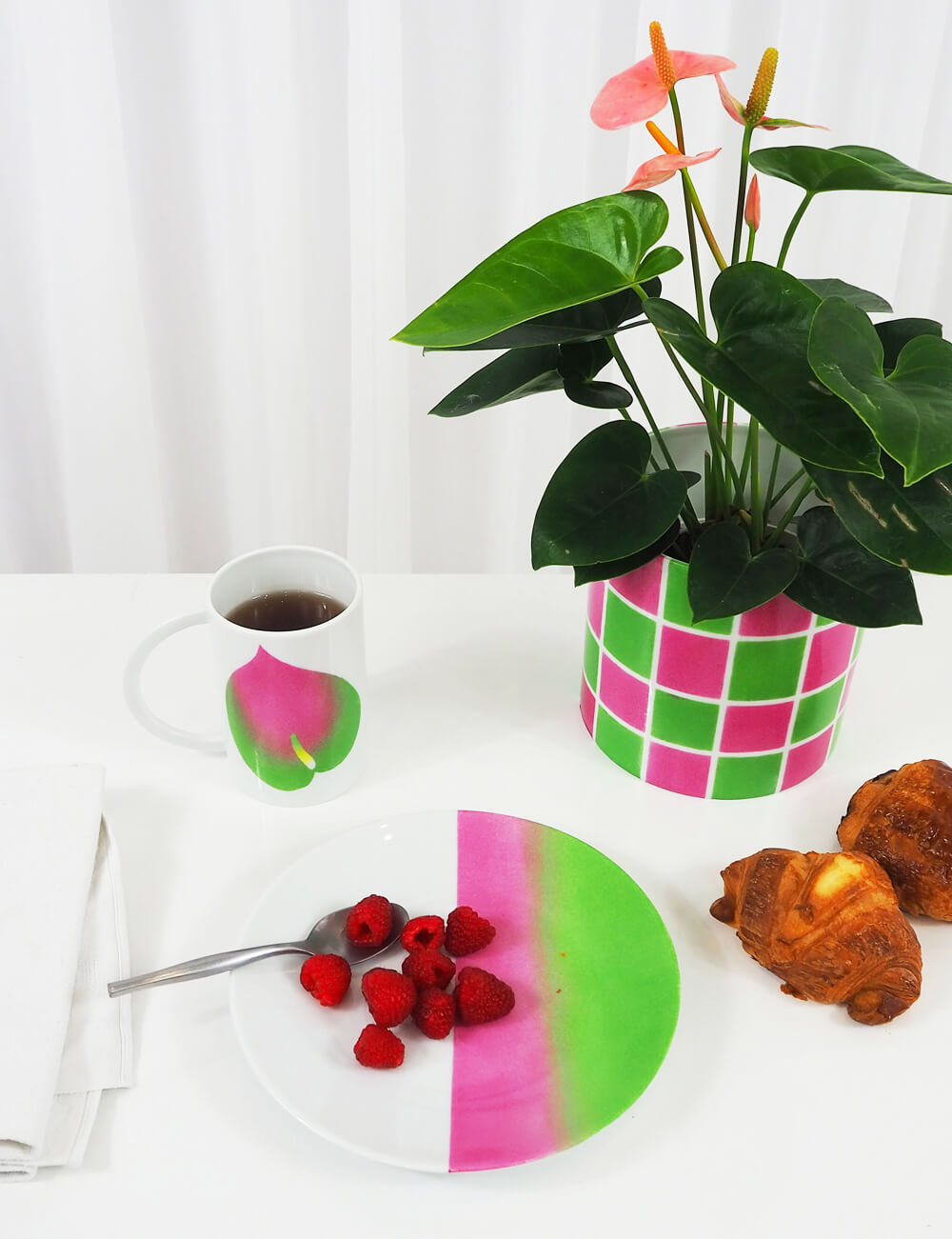 The geometric and original shape of this mug dressed in anthurium flowers makes this object unique and ergonomically perfect for drinking your tea or coffee.