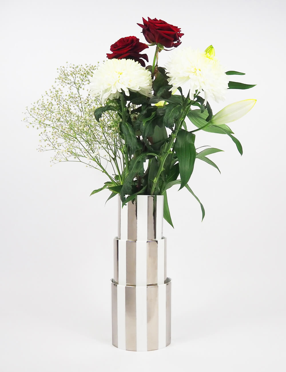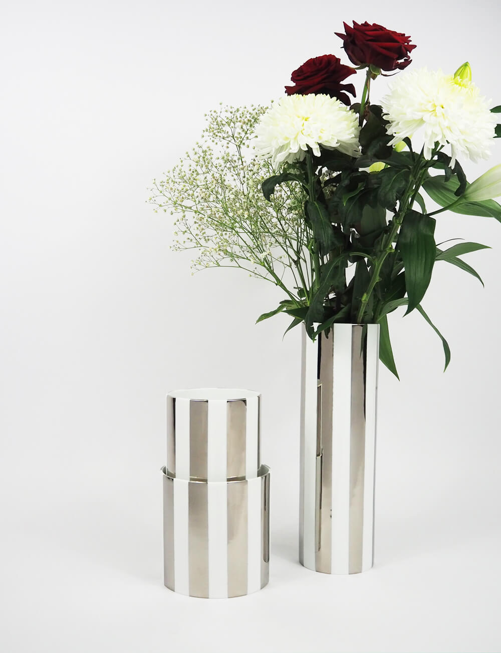 Les vases gigognes sont des cylindres en porcelaine de Limoges de trois tailles différentes qui s’imbriquent les uns dans les autres et qui se suffisent à eux-mêmes de manière indépendante. Le motif rayure est un intemporel qui vient dynamiser la forme et créer des harmonies colorées.